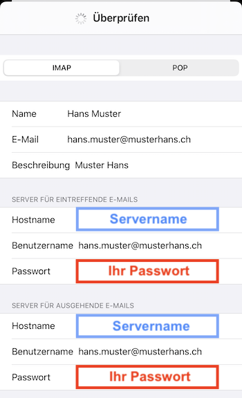 7. Wähle ganz oben POP oder IMAP (Empfehlung: IMAP) aus und gib Deine Benutzerangaben an.