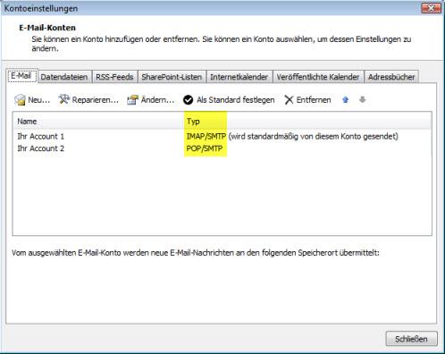 2. Unter Typ ist nun ersichtlich, ob POP3 oder IMAP verwendet wird: