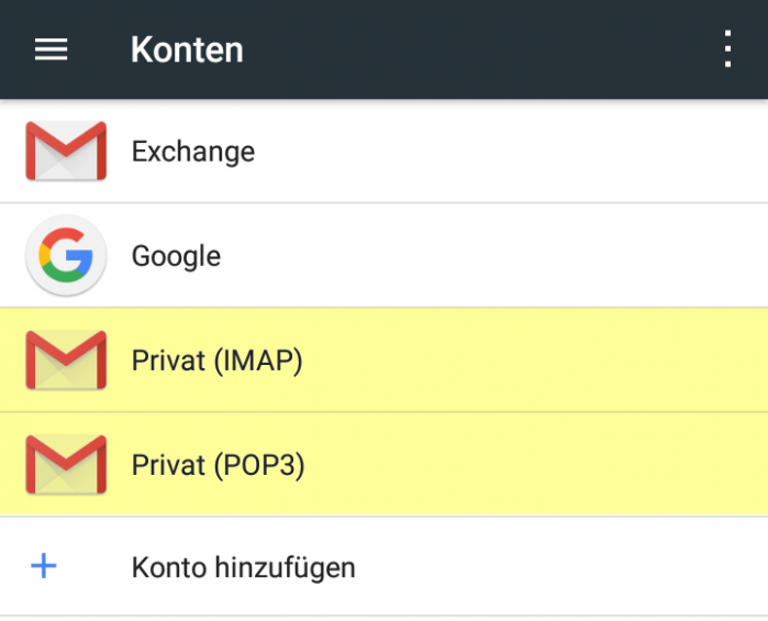02. Android gruppiert die verschiedenen Kontentypen, erscheint Dein Account in der Kategorie Privat (IMAP) so ist es ein IMAP Account. Erscheint er hingegen unter Privat (POP3), so handelt es sich um einen POP3 Account.